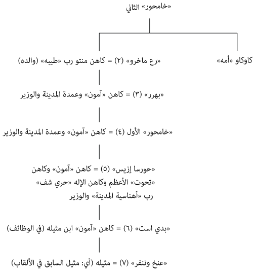 (1) نلحظ: أولًا من نقوش تمثال «خامحور الثاني» وهو الوثيقة الرابعة أن سلسلة النسب «خامحور» «حورسا إزيس» «بدي أست» قد أضيف إليها اسم جديد وهو «عنخ وننفر»، ولما كان التمثالان الرابع والخامس قد صنعا بعد عهد «حورسا إزيس» بأربعة أجيال فإنه من المفهوم أن «خامحور» الذي صنعهما قد أضاف إلى ألقاب «حورسا إزيس» لقب الوزير، وهذا اللقب لم يكن موجودًا بين ألقابه في الوثيقتين الثانية والثالثة وهما اللتان يحتمل أنهما معاصرتان له، وسنرى في خلال بحثنا هذا ظهور بدعة منح المتوفين ألقابًا لم يكونوا يحملونها في مدة حياتهم الدنيوية، ولكن ذلك كان في بعض وثائق من نوع خاص وحسب، وكانت تمنح لهم تمجيدًا وتفاخرًا من الأحياء، وتلك عادة لا تزال موجودة في بلادنا حتى يومنا هذا.
