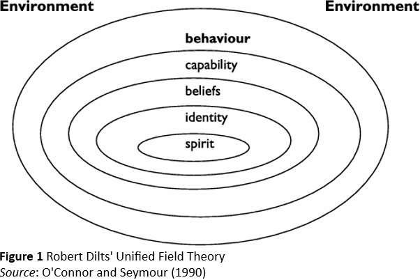 Following the assessment and problem-solving period, it is necessary for educators to share and use the information gathered successfully, so that the learner’s behavior is not just temporarily adjusted. If there is an over-reliance on ‘behavioral strategies’, this can happen. However, in busy schools, this is not easy, and spending time on developing positive relationships is often seen as peripheral to the process of teaching. A therapeutic approach to education does actually mean working with the relationships involved and in fact, socially and psychologically, it is central to the whole process. Emotions and feelings are inextricably tied up in the process of learning and teaching and cannot be ignored. Robert Dilts’ Unified Field Theory (O’Connor and Seymour, 1990) (Figure 1) provides a useful model for considering how educators interact with learners when teaching.