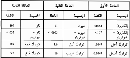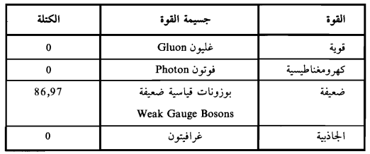 (1-1)، قوى شحنتها كما هو مسجل في الجدول الموجود في الملاحظات - الملحوظة بالفصل الأول، وشدة القوى الثلاث اللاجاذبية في الجدول رقم (1-2)، وعدد آخر قليل لن تذكره هنا فإن العلماء النظريين وضعوا هذه الأرقام في نظريات مجالات الكم الجسيمات المادة وللقوى القوية والضعيفة والكهرومغناطيسية، فكانت النتائج التي أعقبت ذلك في ما يتعلق بالكون المجهري تتطابق بطريقة مدهشة مع النتائج التجريبية. ويصدق ذلك حتى تصل إلى الطاقة التي يمكن أن تسحق المادة إلى أجزاء من المليار من جزء من المليار من المتر، وهي الحدود التقنية الآن. ولهذا السبب يطلق الفيزيائيون على نظرية القوى الثلاث اللاجاذبية وعلى العائلات الثلاث لجسيمات المادة، النظرية القياسية أو (وهو الأغلب) النموذج القياسي لجسيمات الفيزياء.