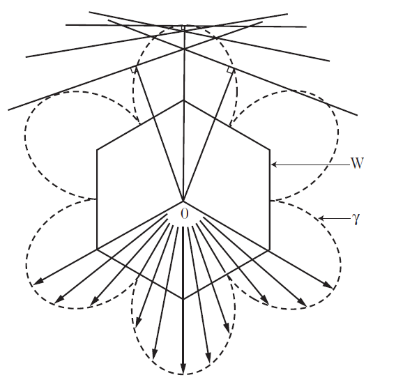 Fig. 1. Wulff construction of the equilibrium shape of a crystal from the γ-graph (dashed curve). O is the center of the crystal. The hexagon represents a projection of the equilibrium shape of the crystal (Wulff polyhedron).