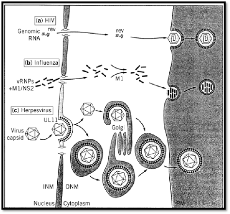 Figure 5. Export of viral material from the nucleus to the cytoplasm and the extracellular compartment. The HIV Rev protein is required for export from the nucleus of full-size and singly spliced viral RNA. An immature capsid gets progressively organized underneath the lipid bilayer of the plasma membrane where viral envelope glycoproteins are concentrated. An analogous process leads to budding of influenza virus particles. Fully assembled herpes virus capsids bud from the inner nuclear membrane and fuse with the outer nuclear membrane, being released naked into the cytoplasm. Naked particles become enwrapped by membranes of the Golgi apparatus and accumulate within a vesicle. Alternatively, the capsid buds through the double membrane of the nucleus, and the outer membrane fuses with a membrane of the Golgi apparatus. The final outcome of this pathway is again an enveloped virus within a cytoplasmic vesicle. Enveloped particles will be released from the cell through fusion of the vesicular membrane with the plasma membrane of the infected cell.