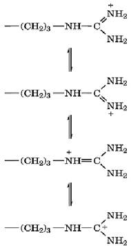 With a pKa value usually of about 12, the guanido group is ionized over the entire pH range in which proteins exist naturally. The ionized guanido group is planar as a result of resonance:
