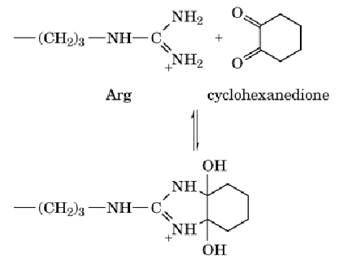 The guanido group can form heterocyclic condensation products with 1,2- and 1,3-dicarbonyl compounds, such as phenylglyoxal, 2,3-butanedione, and 1,2-cyclohexanedione: