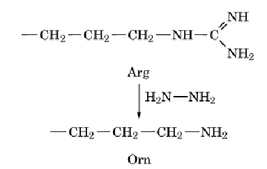 The guanido group can be cleaved by hydrazine (H2NNH2) to produce the side chain of ornithine: