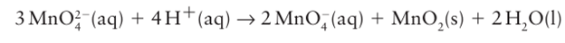 The binary compounds of the 3d-series elements with the halogens and with oxygen also illustrate the trend in stabilities of the group oxidation states. The earliest metals can achieve their group oxidation states in compounds with chlorine (for example, ScCl3 and TiCl4), but the more strongly oxidizing halogen fluorine is necessary to achieve the group oxidation state of V (Group 5) and Cr (Group 6), which form VF5 and CrF6, respectively. Beyond Group 6 in the 3d series, even fluorine cannot produce the group oxidation state, and MnF7 and FeF8 have not been prepared. Oxygen brings out the group oxidation state for many elements more readily than does fluorine because fewer O atoms than F atoms are needed to achieve the same oxidation number, thus decreasing steric crowding. For example, the group oxidation state of +7 for Mn is achieved in manganate (VII) salts, such as potassium permanganate, KMnO4. As can be inferred from the Frost diagram in Fig. 19.3, chromate (VI) CrO4-2, manganate (VII) MnO4, and ferrate (VI) FeO4-2 are strong oxidizing agents and become stronger from CrO4 2 to FeO4-2. This trend is another illustration of the decreasing stability of the maximum attainable oxidation state for Groups 6, 7, and 8. Yet another example of the greater difficulty of oxidizing an element to the right of Cr to its group oxidation state is that the air oxidation of MnO2 in molten potassium hydroxide does not take Mn to its group oxidation state but instead yields the deep green compound potassium manganate (VI), K2MnO4 . The disproportionation of MnO4-2 in acidic aqueous solution yields manganese (IV) oxide (MnO2) and the deep purple manganate (VII) ion MnO4: