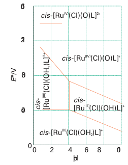 Figure 19.9 A Pourbaix diagram for cis-[RuLCl(OH2)]2 (3) and related species. (Adapted from C.-K. Li, W.-T. Wang, C.-M. Chi, K.-Y. Wong, R.-J. Wang, and T.C.W. Mak, J. Chem. Soc., Dalton Trans. 1991, 1909.)
