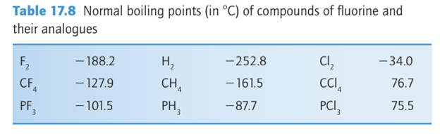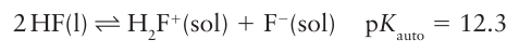The boiling points in Table 17.8 demonstrate that molecular compounds of F tend to be highly volatile, in some cases even more volatile than the corresponding hydrogen com pounds (compare, for example, PF3, b.p. 101.5C, and PH3 , b.p. 87.7C) and in all cases much more volatile than the Cl analogues. The volatilities of the compounds are a result of variations in the strength of the dispersion interaction (the inter action between instantaneous transient electric dipole moments), which is strongest for highly polarizable molecules. The electrons in the small F atoms are gripped tightly by the nuclei, and consequently F compounds have low polarizabilities and hence weak dispersion interactions. There are some opposite effects on volatility that can be traced to hydrogen bonding. The structure of solid HF is a planar zigzag chain polymer of F H…F units. Although liquid HF has a lower density and viscosity than water, which suggests the absence of an extensive three-dimensional network of H bonds, in the gas phase HF forms H-bonded oligomers, (HF)n with n up to 5 or 6. As with H2O and NH3, the properties of HF, such as a wide liquid range, make it an excellent nonaqueous solvent. Hydrogen fluoride undergoes autoprotolysis: