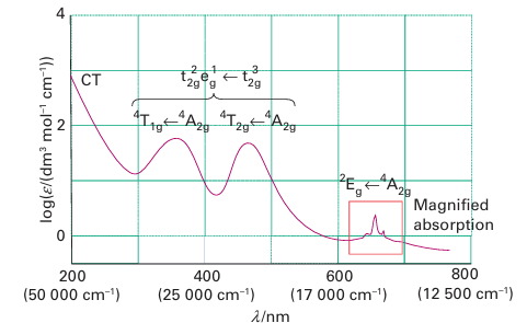 Key point: Electron-electron repulsions result in multiple absorptions in the electronic spectrum. Figure 20.22 sets the stage for our discussion by showing the electronic absorption spectrum of the d3 complex [Cr (NH3)6]3+ in aqueous solution. The band at lowest energy (longest wavelength) is very weak; later we shall see that it is an example of a ‘spin-forbidden’ transition. Next are two bands with intermediate intensities; these are ‘spin-allowed’ transitions between the t2g and eg orbitals of the complex, which are mainly derived from the