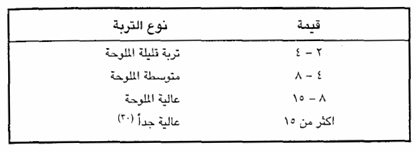 وتقاس ملوحة التربة بالتوصيل الكهربائي (Electric conductivity) (EC) إذ تكون التربة المالحة موصلة للكهرباء وتزداد درجة التوصيل بزيادة نسبة الملوحة ويقاس ذلك بالمليموز / سم فإذا كانت قيمة كبيرة دلت على الملوحة العالية، ولهذا تصنف الترب حسب ذلك وكما يأتي: