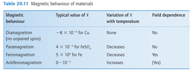 The magnetic susceptibility, x, of a material is a measure of how easy it is to align electron spins with the applied magnetic field in the sense that the induced magnetic moment is proportional to the applied field, with the constant of proportionality. A paramagnetic material has a positive susceptibility and a diamagnetic material has a negative susceptibility. Magnetic effects arising from cooperative phenomena can be very much larger than those arising from individual atoms and ions. The susceptibility and its variation with temperature are different for different types of magnetic materials and are summarized in Table 20.11 and Fig. 20.37. The application of a magnetic field to a paramagnetic material result in the partial alignment of the spins parallel to the field. As a paramagnetic material is cooled, the dis ordering effect of thermal motion is reduced, more spins become aligned, and the magnetic susceptibility increases. In a ferromagnetic substance, which is one example of a cooperative magnetic property, the spins on different metal centres are coupled into a parallel alignment that is sustained over thousands of atoms to form a magnetic domain (Fig. 20.38). The net magnetic moment, and hence the magnetic susceptibility, may be
