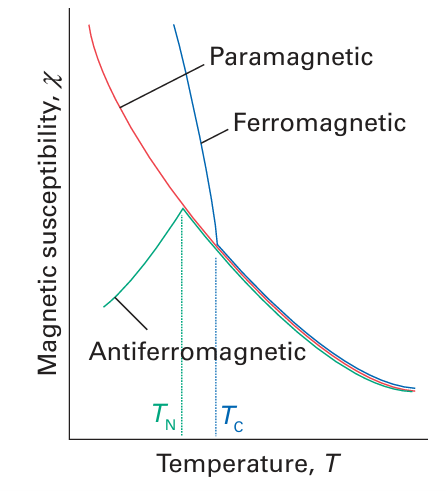 Figure 20.37 The temperature dependence of the susceptibilities of paramagnetic, ferromagnetic, and antiferromagnetic substances.