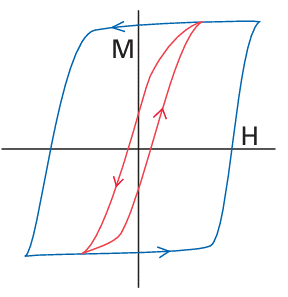 Figure 20.39 Magnetization curves for ferromagnetic materials. A hysteresis loop results because the magnetization of the sample with increasing field (→) is not retraced as the field is decreased (←). Blue line: hard ferromagnet; red line: soft ferromagnet.