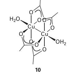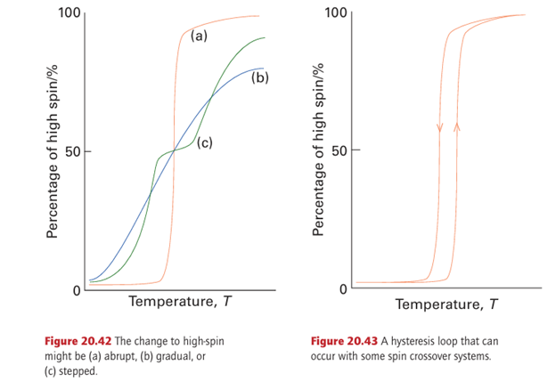 very large because the magnetic moments of individual spins add to each other. Moreover, once established and with the temperature maintained below the Curie temperature (TC), the magnetization persists after the applied field is removed because the spins are locked together. Ferromagnetism is exhibited by materials containing unpaired electrons in d or, more rarely, f orbitals that couple with unpaired electrons in similar orbitals on surround ing atoms. The key feature is that this interaction is strong enough to align spins but not so strong as to form covalent bonds, in which the electrons would be paired. At temperatures above TC the disordering effect of thermal motion overcomes the ordering effect of the interaction and the material becomes paramagnetic (Fig. 20.37). The magnetization, M, of a ferromagnet, its bulk magnetic moment, is not propor tional to the applied field strength H. Instead, a ‘hysteresis loop’ is observed like that shown in Fig. 20.39. For hard ferromagnets the loop is broad and M remains large when the applied field has been reduced to zero. Hard ferromagnets are used for permanent magnets where the direction of the magnetization does not need to be reversed. A soft ferromagnet has a narrower hysteresis loop and is therefore much more responsive to the applied field. Soft ferromagnets are used in transformers, where they must respond to a rapidly oscillating field. In an antiferromagnetic material, neighbouring spins are locked into an antiparallel alignment (Fig. 20.40). As a result, the collection of individual magnetic moments cancel and the sample has a low magnetic moment and magnetic susceptibility (tending, in fact, to zero). Antiferromagnetism is often observed when a paramagnetic material is cooled to a low temperature and is indicated by a sharp decrease in magnetic susceptibility at the Néel temperature, TN (Fig. 24.37). Above TN the magnetic susceptibility is that of a para magnetic material, and decreases as the temperature is raised. The spin coupling responsible for antiferromagnetism generally occurs through inter vening ligands by a mechanism called superexchange. As indicated in Fig. 20.41, the spin on one metal atom induces a small spin polarization on an occupied orbital of a ligand, and this spin polarization results in an antiparallel alignment of the spin on the adjacent metal atom. This alternating …↑↓↑↓… alignment of spins then propagates throughout the material. Many d-metal oxides exhibit antiferromagnetic behaviour that can be ascribed to a superexchange mechanism involving O atoms, for example MnO is antiferromagnet ic below 122 K and Cr2 O3 is antiferromagnetic below 310 K. Coupling of spins through intervening ligands is frequently observed in molecular complexes containing two ligand bridged metal ions but it is weaker than with a simple O2 link between metal sites and as a result the ordering temperatures are much lower, typically below 100 K. In ferrimagnetism, a net magnetic ordering of ions with different individual magnetic moments is observed below the Curie temperature. These ions can order with opposed spins, as in antiferromagnetism, but because the individual spin moments are different, there is incomplete cancellation and the sample has a net overall moment. As with antiferro-magnetism, these interactions are generally transmitted through the ligands; an example is magnetite Fe3O4. There are a large number of molecular systems where magnetic coupling is observed. Typical systems have two or more metal atoms bridged by ligands that mediate the coupling. Simple examples include copper acetate (10), which exists as a dimer with antiferromagnetic coupling between the two d9 centres. Many metalloenzymes (Sections 27.9 to 27.14) have multiple metal centres that show magnetic coupling.