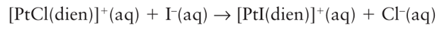where dien is diethylenetriamine (NH2 CH2CH2 NHCH2 CH2 NH2). It is found, for instance, that use of I instead of Br increases the rate constant by an order of magnitude. Experi mental observations on the substitution reactions of square-planar complexes support the view that the rate-determining step is associative.