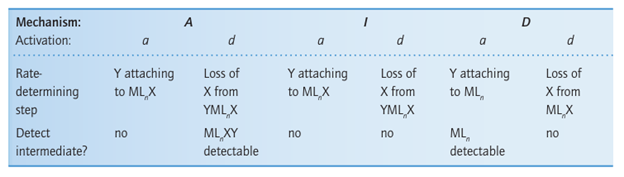 A reaction that has an interchange mechanism (I) can be either associatively or dissociatively activated, and is designated either Ia or Id, respectively. In an Ia mechanism, the rate of reaction depends on the rate at which the M…Y bond forms, whereas in an Id reaction the rate of reaction depends on the rate at which the M…X bond breaks (Fig. 21.7). The distinction between these possibilities may be summarized as follows, where MLnX denotes the initial complex: