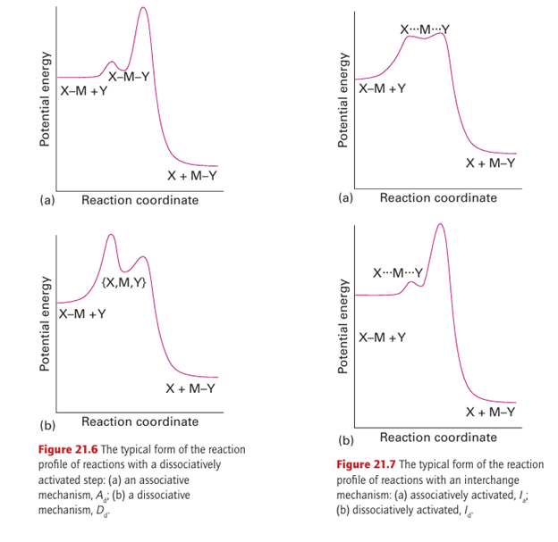 It is found that replacement of NH3 by pyridine in this reaction changes the rate by at most a few per cent. The weak dependence on Y of a dissociatively activated process indicates that the rate of formation of the transition state is determined largely by the rate at which the bond to the leaving group X can break. A reaction with an associative mechanism (A) will be dissociatively activated (d) provided the loss of X from the intermediate YMLn X is the rate determining step; such a reaction is designated Ad. A reaction with a dissociative mechanism (D) is dissociatively activated (d) if the initial loss of X from the reactant MLn X is the rate-determining step, such a reaction is designated Dd. In this case, the intermediate MLn would not be detected. Figure 21.6 shows the reaction profiles for dissociatively activated A and D mechanisms.