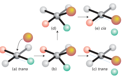 Figure 21.9 The stereochemistry of substitution in a square-planar complex. The normal path (resulting in retention) is from (a) to (c). However, if intermediate (b) is sufficiently long-lived, it can undergo pseudo rotation to (d), which leads to isomer (e).