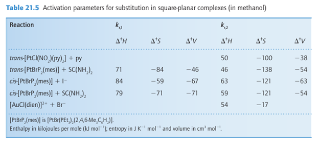 Key point: Negative volumes and entropies of activation support the view that the rate-determining step of square-planar Pt (II) complexes is associative. Another clue to the nature of the transition state comes from the entropies and volumes of activation for reactions of Pt (II) and Au (III) complexes (Table 21.5). The entropy of activation is obtained from the temperature dependence of the rate constant, and indicates the change in disorder (of reactants and solvent) when the transition state forms. Likewise, the volume of activation, which is obtained (with considerable difficulty) from the pressure dependence of the rate constant, is the change in volume that occurs on formation of the transition state. 1Note that the stereochemistry is quite different from that of p-block central atoms, such as Si (IV) and P(V), where the leaving group departs from the more crowded axial position.