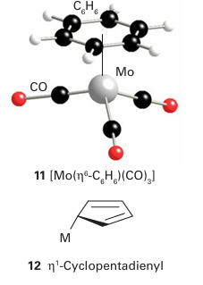Key point: The naming of organometallic compounds is similar to the naming of coordination com pounds, but certain ligands have multiple bonding modes, which is reported as the hapticity. According to the recommended convention, we use the same system of nomenclature for organometallic compounds as set out for coordination complexes in Section 7.2. Thus, ligands are listed in alphabetical order followed by the name of the metal, all of which is written as one word. The name of the metal should be followed by its oxidation number in parentheses. The nomenclature used in research journals, however, does not always obey these rules, and it is common to find the name of the metal buried in the mid dle of the name of the compound and the oxidation number omitted. For example, (11) is sometimes referred to as benzene molybdenum-tricarbonyl, rather than the preferred name benzene(tricarbonyl)molybdenum (0). The IUPAC recommendation for the formula of an organometallic compound is to write it in the same form as for a coordination complex: the symbol for the metal is written first, followed by the ligands, listed in alphabetical order based on their chemical symbol. We shall follow these conventions unless a different order of ligands helps to clarify a particular point. Often a ligand with carbon donor atoms can exhibit multiple bonding modes—for instance, the cyclopentadienyl group can commonly bond to a d-metal atom in three different ways—thus, we need some additional nomenclature. Without going into the intimate details of the bonding of the various ligands (we do that later in this chapter), the extra information we need to describe a bonding mode is the number of points of attachment. This procedure gives rise to the notion of hapticity, the number of ligand atoms that are considered formally to be bonded to the metal atom. The hapticity is denoted ηn, where n is the number of atoms (and η is eta). For example, a CH3 group attached by a single MC bond is monohapto, η1, and if the two C atoms of an ethene ligand are both within bonding distance of the metal, the ligand is dihapto, η2. Thus, three cyclopentadienyl complexes might be described as having η1 (12), η3 (13), or η5 (14) cyclopentadienyl groups.
