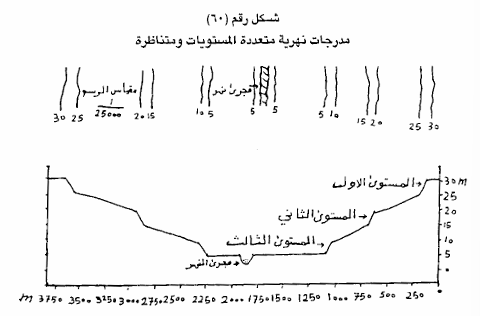 4- رسم خط أفقي يمثل المسافة الأفقية للمقطع وخطين عند نهايتي الخط الأفقي متعامدين عليه يمثلان ارتفاع مستويات المدرجات على جانبي المجرى.