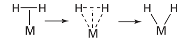 Bridging hydrides exist, where an H atom bridges either two or three metal atoms: here the bonding can be treated in exactly the same way we considered bridging hydrides in diborane, B2H6 (Section 2.11). Although the first organometallic metal hydride was reported in 1931, complexes of hydrogen gas, H2 , were identified only in 1984. In such compounds, the dihydrogen molecule, H2 , bonds side-on to the metal atom (in the older literature, such compounds were sometimes called non-classical hydrides). The bonding of dihydrogen to the metal atom is considered to be made up of two components: a σ donation of the two electrons in the H2 bond to the metal atom (24) and a π backdonation from the metal to the σ* antibonding orbital of H2 (25). This picture of the bonding raises a number of interesting issues. In particular, as the π backbonding from the metal atom increases, the strength of the HH bond decreases and the structure tends to that of a dihydride: