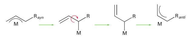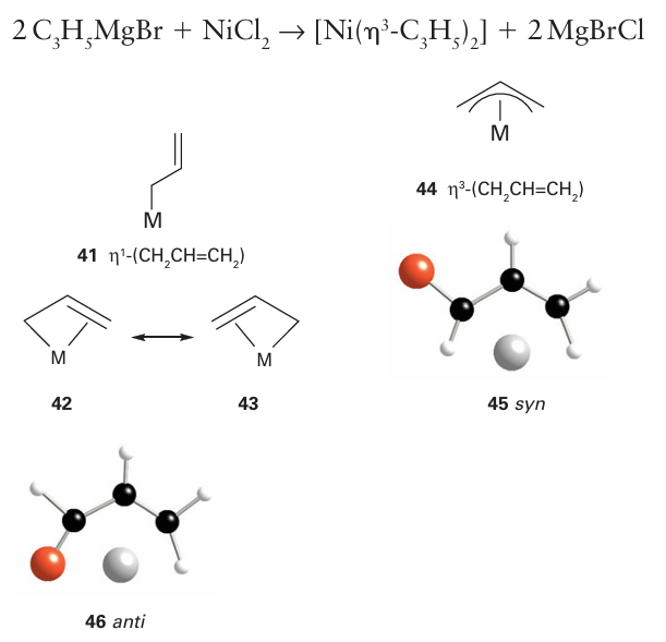 Because of this flexibility in the bonding, η3-allyl complexes are often highly reactive as transformation to the η1-form allows them to bind readily to another ligand. There are many synthetic routes to allyl complexes. One is the nucleophilic attack of an allyl Grignard reagent on a metal halide: