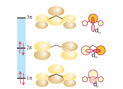 Figure 22.9 The molecular orbitals of the π system of the allyl group; also shown are metal d orbitals of appropriate symmetry to form bonding interactions.