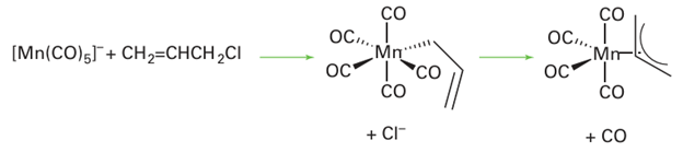 Nucleophilic attack on a haloalkane by a metal atom in a low oxidation state also yields allyl complexes: