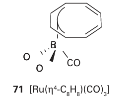 Nuclear magnetic resonance provides the primary evidence for the existence and mechanism of these fluxional processes, as they occur on a timescale of 10 2 to 10 4 s, and can be studied by 1H- and 13C-NMR. The compound [Ru(4-C8H8) (CO)3] (71) provides a good illustration of the approach. At room temperature, its 1H-NMR spectrum consists of a single, sharp line that could be interpreted as arising from a symmetrical 8-C8 H8 ligand. However, X-ray diffraction studies of single crystals show unambiguously that the ligand is tetrahapto. This conflict is resolved by 1H-NMR spectra at lower temperatures because as the sample is cooled the signal broadens and then separates into four peaks. These peaks are expected for the four pairs of protons of an 4-C8 H8 ligand. The interpretation is that at room temperature the ring is ‘whizzing’ around the metal atom rapidly compared with the timescale of the NMR experiment, so an averaged signal is observed. At lower temperatures the motion of the ring is slower, and the distinct conformations exist long enough to be resolved. A detailed analysis of the line shape of the NMR spectra can be used to measure the activation energy of the migration.