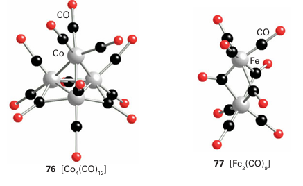 we shall consider any MM bonded system as a cluster. The distinction between cage and cluster compounds can seem arbitrary as the presence of bridging ligands in a cluster such as (76) raises the possibility that the atoms are held together by M L M interactions rather than MM bonds. Bond lengths are of some help in resolving this issue. If the MM distance is much greater than twice the metallic radius, then it is reasonable to conclude that the MM bond is either very weak or absent. However, if the metal atoms are within a reasonable bonding distance, the proportion of the bonding that is attribut able to direct MM interaction is ambiguous. For example, there has been much debate about the extent of Fe-Fe bonding in [Fe2 (CO)9] (77). Metal-metal bond strengths in metal complexes cannot be determined with great precision, but a variety of pieces of evidence—such as the stability of compounds and MM force constants—indicate that there is an increase in M-M bond strengths down a group in the d block. This trend contrasts with that in the p block, where element-element bonds are usually weaker for the heavier members of a group. As a consequence of this trend, metal-metal bonded systems are most numerous for the 4d- and 5d-series metals.