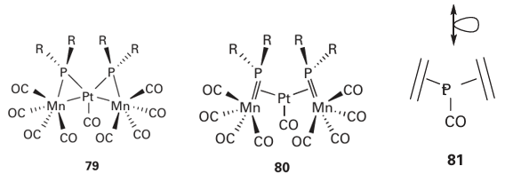 and [Co4 (CO)12] (76), both of which can be regarded as triangular Co3(CO)9 fragments capped on one side either by Co (CO)3 or by CH. A minor complication in this comparison is the occurrence of Co(CO)2 groups together with bridging CO ligands in [Co4 (CO)12] because bridging and terminal ligands often have similar energies. Further inspection of the isolobal fragments given in Table 22.10 shows that a P atom is isolobal with CH; accordingly, a cluster similar to [Co3(CH)(CO)9] (78) is known, but with a capping P atom. Similarly, the ligands CR2 and Fe (CO)4 are both capable of bonding to two metal atoms in a cluster; CH3 and Mn (CO)5 can bond to one metal atom. As a final example of isolobal analogies, consider the mixed manganese and platinum complex (79): the three-membered {Mn, Pt, P} rings can be considered as the metallocyclo propane form of a coordinated double bond (80). Both halves of the Mn P fragments are isolobal with CH2 if we treat them as PR2 and Mn (CO)4; the complete fragment can then be treated as analogous to an ethene molecule. This treatment means that (79) can be considered analogous to bis-(ethene) carbonyl platinum (0) (81), a known simple 16-electron organometallic compound.