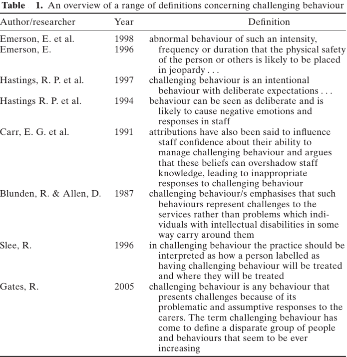 The Department of Health (1993) pointed out that any successful interventions rely on staff/carers having a broad knowledge base in relation to safe reactive strategies, psychological and behavioral approaches and long-term skills-teaching strategies. Skills and knowledge linked with behavior are central in managing challenging behavior and have been shown to be effecive (Lindsay 2001). It is useful to have an overview of a range of definitions; these are presented in Table 1.
