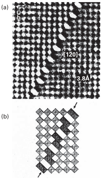 Figure 24.2 (a) High resolution electron micrograph lattice image of a crystallographic shear plane in WO3-x (b) The oxygen octahedral polyhedra that surround the W atoms imaged in the electron micrograph. Note the edge-shared octahedra along the crystallographic shear plane. [Reproduced by permission from S. Iijima, J. Solid State Chem. 1975, 14, 52].