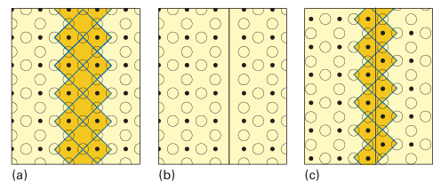 Figure 24.1 The concept of a crystallographic shear plane illustrated by the (100) plane of the ReO3 structure. (a) A plane of metal, Re, and oxygen, O, atoms. The octahedron around each metal atom is completed by a plane of oxygen atoms above and below the plane illustrated here. Some of the octahedra are shaded to clarify the processes that follow. (b) Oxygen atoms in the plane perpendicular to the page are removed, leaving two planes of metal atoms that lack their sixth oxygen ligand. (c) The octahedral coordination of the two planes of metal atoms is restored by translating the right slab as shown. This creates a plane (labelled a shear plane) vertical to the paper in which the MO6 octahedra share edges.
