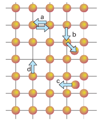Figure 24.3 Some diffusion mechanisms for ions or atoms in a solid: (a) two atoms or ions exchange positions, (b) an ion hops from a normally occupied site in the structure to an interstitial site, which produces a vacancy which can then be filled by movement of an ion from another site, (c) an ion hops between two different interstitial sites and (d) an ion or atom moves from a normally occupied site to a vacancy, so producing a new vacant site.