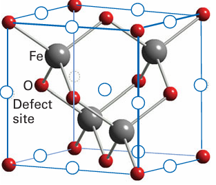 Figure 24.10 Defect sites proposed for Fe1-x O. Note that the tetrahedral Fe3+ interstitials (grey spheres) and octahedral Fe2+ vacancies (circles) are clustered together.