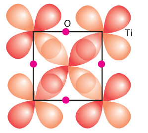 Figure 24.11 Overlap of the dzx orbitals in TiO to give a t2g band. In the perpendicular directions the dyx and dzy orbitals overlap in an identical manner.