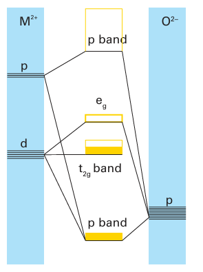 Figure 24.12 Molecular orbital energy level diagram for early d-metal monoxides. The t2g band is only partly filled and metallic conduction results.