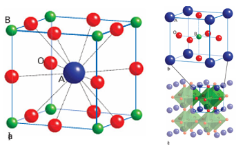 Key points: The perovskites have the general formula ABX3, in which the 12-coordinate hole of a ReO3 type BX3 structure is occupied by a large A ion; the perovskite barium titanate, BaTiO3, exhibits ferro electric and piezoelectric properties associated with cooperative displacements of the ions. The perovskites have the general formula ABX3, in which the 12-coordinate hole of BX3 (as in ReO3) is occupied by a large A ion (Fig. 24.19; a different view of this structure is given in Fig. 3.42) The X ion is most frequently O2 or F (as in NaFeF3) although nitride- and hydride-containing perovskites can also be synthesized, such as in LiSrH3. Perovskite itself is named after the naturally occurring oxide mineral CaTiO3 and the largest class of perovskites are those with the anion as oxide. This breadth of perovskites is widened by the observation that solid solutions and nonstoichiometry are also common features of the perovskite structure, as in Ba1-x Srx TiO3 and SrFeO3-y. Some metal-rich materials adopt the perovskite structure with the normal distribution of cations and anions partially inverted, for instance SnNCo3. The perovskite structure is often observed to be distorted such that the unit cell is no longer centrosymmetric and the crystal acquires an overall permanent electric polarization as a result of ion displacements. Some polar crystals are ferroelectric in the sense that they resemble ferromagnets, but instead of the electron spins being aligned over a region of the crystal, the electric dipole moments of many unit cells are aligned. As a result, the relative permittivity, which reflects the polarity of a compound, for a ferroelectric material often exceeds 1x103 and can be as high as 1.5x104; for comparison, the relative permittivity of liquid water is about 80 at room temperature. Barium titanate, BaTiO3, is the most extensively studied example of such a material. At temperatures above 120°C this compound has the perfect cubic perovskite structure. At room temperature, it adopts a lower symmetry, tetragonal unit cell in which the various ions can be considered as having been dis placed from their normal high symmetry sites (Fig. 24.20). This displacement results in a spontaneous polarization of the unit cell and formation of an electric dipole; coupling between these ion displacements and therefore the induced dipoles is very weak. Application