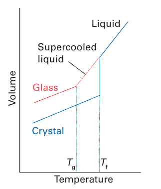 An instructive comparison between vitreous and crystalline materials is seen in their change in volume with temperature (Fig. 24.32). When a molten material crystallizes, an abrupt change in volume (usually a decrease) occurs. By contrast, a glass-forming material that is cooled sufficiently rapidly persists as a metastable supercooled liquid. When cooled below the glass transition temperature Tg, the supercooled liquid becomes rigid, and this change is accompanied by only an inflection in the cooling curve rather than an abrupt change in slope. The rates of crystallization are very slow for many complex metal silicates, phosphates, and borates, and it is these compounds that often form glasses.