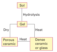 Figure 24.33 Schematic diagram of the sol–gel process. When the gel is dried at high temperatures dense ceramics or glasses are formed. Drying at low temperatures above the critical pressure of water produces porous solids known as xerogels or aerogels.