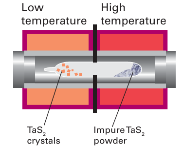 Figure 24.37 Vapour transport crystal growth and purification of TaS2. A small quantity of I2 is present to serve as a transport agent.