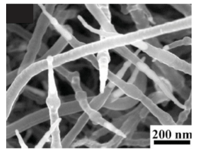 Figure 25.19 FESEM image of Cu-filled CNTs; all have sharp tips filled with metal nanoneedles. These CNTs are up to 5 µm long, with outer diameters in a range of 40–80 nm. (L. X. Dong, et al., Nano Lett. 2007, 7, 58.)