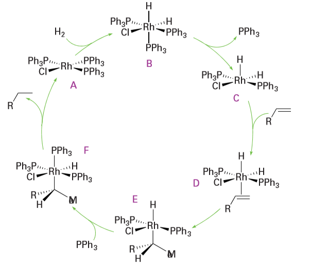 Key points: Wilkinson’s catalyst, [RhCl (PPh3)3], and related complexes are used for the hydrogenation of a wide variety of alkenes at pressures of hydrogen close to 1 atm or less; suitable chiral ligands can lead to enantioselective hydrogenations. The addition of hydrogen to an alkene to form an alkane is favoured thermodynamically (∆rGO=-101 kJ mol-1 for the conversion of ethene to ethane). However, the reaction rate is negligible at ordinary conditions in the absence of a catalyst. Efficient homogeneous and heterogeneous catalysts are known for the hydrogenation of alkenes and are used in such diverse areas as the manufacture of margarine, pharmaceuticals, and petrochemicals. One of the most studied catalytic systems is the Rh(I) complex [RhCl (PPh3)3], which is often referred to as Wilkinson’s catalyst. This useful catalyst hydrogenates a wide variety of alkenes and alkynes at pressures of hydrogen close to 1 atm or less at room temperature. The dominant cycle for the hydrogenation of terminal alkenes by Wilkinson’s catalyst is shown in Fig. 26.5. It involves the oxidative addition of H2 to the 16-electron complex [RhCl (PPh3)3] (A), to form the 18-electron dihydrido complex (B). The dissociation of a