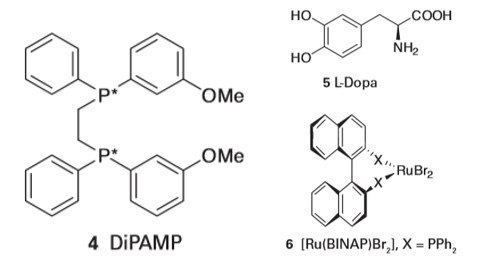 ■A brief illustration. Areaction that gives 51 per cent of one enantiomer and 49 per cent of another would be described as having an enantiomeric excess of 2 per cent; a reaction that gave 99 per cent of one enantiomer and 1 per cent of another would have ee=98 per cent. An enantioselective hydrogenation catalyst containing a chiral phosphine ligand referred to as DiPAMP (4) is used to synthesize L-dopa (5), a chiral amino acid used to treatParkinson’s disease. An interesting detail of the process is that the minor diastereomer in solution leads to the major product. The explanation of the greater turnover frequency of the minor isomer lies in the difference in activation Gibbs energies (Fig. 26.6). Spurred on by clever ligand design and using a variety of metals, this field has grown rapidly and provides many clinically useful compounds; of particular note are systems derived from ruthenium (II) BINAP (6).3