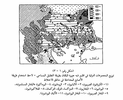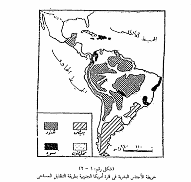 وبطبيعة الحال ليست طريقة التظليل المساحى قاصرة على نوع واحد من خرائط التوزيعات الجغرافية بل نجد كثيراً من التوزيعات السكانية تستخدم هذه الطريقة في خرائطها المساحية غير الكمية، ومنها خرائط توزيع التركيب الوظيفي للسكان، وتوزيع الأجناس، وتوزيع المجموعات العرقية، وتوزيع ا العقائد الدينية وتوزيع أمراض السكان. فإذا نظرنا إلى الخريطة في الشكل رقم (1-2) والتي توضح توزيع الأجناس البشرية في قارة أمريكا الجنوبية توزيعاً مكانياً غير كمي، بمعنى أنه لا يشير إلى أكثر من توزيع السكان السود والبيض والهنود والمخلطون حسب مناطق انتشارهم بتظليلات معينة. وقد كان يمكن اختيار عدد آخر من التظليلات يختلف تماماً عن التظليلات التي اختراناها لتمثيل هذه المجموعات كما كان من الممكن استبدال التظليلات التي استخدمناها بألوان مختلفة توضح مثل هذا التوزيع والتي تبين توزيع المجموعات العرقية في اقليم شبه جزيرة البلقان منجد أن هناك مساحات مظللة بتظليلات مختلفة يدل كل منها على المجموعة العرقية السائدة في منطقتها المظللة ويجب أن نلفت النظر إلى أن إنشاء مثل هذه الخريطة يعتمد أساساً على أسس كمية في الأصل، فقد وزع سكان كل مجموعة على أساس نسبتهم العددية في كل وحدة مساحية، وعلى أساس النسب الغالبة لكل مجموعة حددت مناطق وجودها بشكل عام وبذلك ظهرت مناطق تسود فيها هذه المجموعة العرقية أو تلك ظللت بأنماط مختلفة من التظليلات ولا تنقل مثل هذه الخرائط إلى القارئ كثافة سكان كل مجموعة فى هذه التوزيعات النوعية، ولو أن هناك محاولات بذلت لإنتاج خريطة للتوزيعات الجنسية في الاقليم على خريطة كثافة السكان لنفس الاقليم ومن أشهر تلك الخرائط الخريطة بشعوب أوربا التي نشرت في فيينا عام 1971 Monkhouse & Wilkinson.