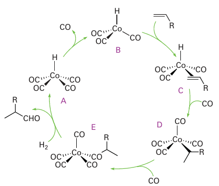 Key point: The mechanism of hydrocarbonylation is thought to involve a pre-equilibrium in which octa carbonyldicobalt combines with hydrogen at high pressure to give a monometallic species that brings about the actual hydrocarbonylation reaction. In a hydroformylation reaction, an alkene, CO, and H2 react to form an aldehyde containing one more C atom than in the original alkene: