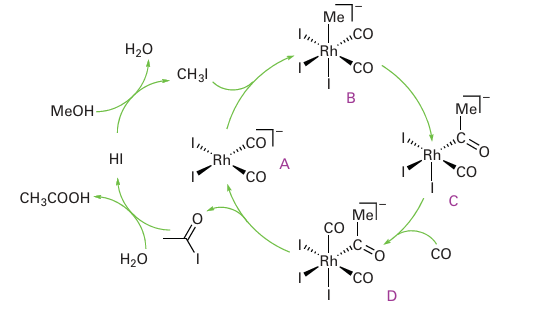 The reaction is catalysed by all three members of Group 9 (Co, Rh, and Ir). Originally a Co complex was used, but then a Rh catalyst developed at Monsanto greatly reduced the cost of the process by allowing lower pressures to be used. As a result, the rhodium-based Monsanto process was used throughout the world. Subsequently, British Petroleum developed the Cativa process, which uses a promoted Ir catalyst. Both processes are highly selective and generate ethanoic acid of sufficient purity that it can be used in human food. The Monsanto and Cativa processes follow essentially the same reaction sequence, so the rhodium-based cycle described here captures the principal features of the iridium-based process too (Fig. 26.13). Under the conditions used, I ions that are present react with methanol to set up an appreciable concentration of iodomethane in the first step of the reaction. Starting with the four-coordinate, 16-electron complex [Rh (CO)2I2] (A), the next step is the oxidative addition of iodomethane to produce the six-coordinate 18-electron complex [Rh (Me)(CO)2I3] (B). This step is followed by methyl migration, yielding a 16-electron acyl complex (C). Coordination of CO restores an 18-electron complex (D), which is then set to undergo reductive elimination of acetyl iodide with the regeneration of [Rh (CO)2I2]. Water then hydrolyses the acetyl iodide to acetic acid and regenerates HI. Under normal operating conditions, the rate-determining step for the rhodium-based system is the oxidative addition of iodomethane, whereas for the iridium-based system it is the migration of the methyl group. An important feature is that methyl migration on iridium is favoured by formation of a neutral intermediate, and iodide-accepting promoters help facilitate substitution of an iodide ligand by CO in the Ir analogue of complex (B)