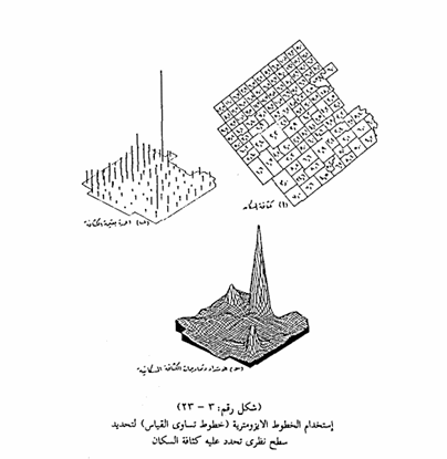 وصفوة القول أنه يمكن استخدام الخطوط الايزومترية لتحديد سطح نظرى أو معنوي مثل السطح الذي نحدد عليه كثافة السكان، وفي هذه الحالة تصبح قيم لتجديد عبارة عن معدلات أي متوسط عدد الأشخاص في كل متر مربع مثلا ولنضرب مثالا يوضح طريقة التمثيل بخطوط التساوي الأيزو مترية فإذا كانت دينا بيانات من كثافة السكان في منطقة ما موقعه في منتصف كل وحدة إدارية منها فإننا نقوم بتحويلها إلى شكل بياني - أي بإقامة أعمدة على كل وحدة يتناسب طولها مع الكمية التي يمثلها ويمكن بعد ذلك توضيح هذا الشكل بطريقة أخرى تبين نفس التوزيع ولكن بصورة أخرى لا تظهر شكل السطح بأبعاده الثلاثة فحسب، بل توضح بعض الخصائص المتمثلة في الامتداد إلى جانب اختلافات تموجات الكثافة السكانية على أنه يمكن اعتبار أن الشكل الأخرى تمثيلا لسطح احصائى يتكون من سلسلة من القيم المتوسطة التي تتصف بأن لها ثلاثة أبعاد(س، ص، ع) للوحدات المساحية المختارة. حيث تمثل (س)، (ص) الامتداد الأفقى للوحدة المساحية، بينما تمثل (ع) الارتفاع النسبي المفترض الذي يكون فوق أو تحت منسوب أفقى معين يسمى مستوى المقارنة Datum ولما كانت كل وحدة مساحية هنا تمثل مجموعا كبيرا أو صغيرا من القيم النقطية، فليس هناك نقطة مفردة يمكن أن تكون لها لهذه القيمة المتوسطة (كثافة السكان) ومع ذلك فمن الضروري في مثل هذه الحالة أن تفترض أو ندعي وجود مثل هذه القيم المتوسطة عند نقطة مفردة إذا أردنا أن تمثل تموجات هذا السطح الاحصائي بخطوط التساوى الايزومترية.