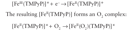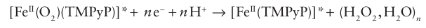 This iron (II) porphyrin oxygen complex then undergoes reduction to water and hydrogen peroxide: